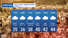 In the event you’re working the New York Metropolis Half Marathon Sunday, search for temperatures within the 30s at first of the race, with a sluggish warm-up into the mid-40s by mid-day.  Don’t anticipate any solar on Sunday.  Clouds will probably be cussed, however that’s not a foul factor for runners.  The excellent news is that the clouds gained’t carry any rain.  The race must be dry from starting to finish.