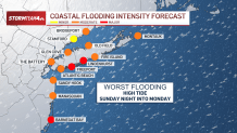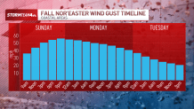 Wind gusts of as much as 60 mph are anticipated late Sunday into Monday — though inland gusts might be decrease, however downed timber and energy outages might be doable. Lengthy Island, NYC and the Jersey Shore are most probably to see the excessive winds.